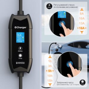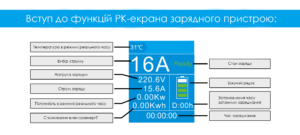 – OLED-екран дає змогу зробити необхідні параметри та ознайомитися з такими показниками: індикатор потужності, статус з’єднання, індикатор заряджання, аварійна сигналізація. Можливість вибору швидкості зарядки та регулювання сили струму, доступні режими (8A – 1,5 кВт./10A – 2 кВт./13A – 2.5 кВт./16A – 3.5 кВт.)