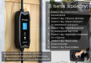 – Надійна конструкція, корпус пристрою ефективно запобігає потраплянню пилу та бруду в інтерфейс зарядного блоку, так корпус загалом. Пристрій зроблено, з стійкого до зовнішніх умов термопластику, який надійний та довговічний він забезпечує хороше розсіювання тепла. Кабель довжиною 5 м. міцний та надійний, підходить для використання на різних паркінгу або в гаражі . Завдяки гнучкості його можна повісити на кронштейн після використання, після повної зарядки авто пристрій автоматично вимкнеться.